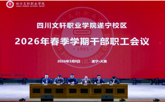 3月9日上午,遂宁校区召开2026年春季学期干部职工会议。学校校长助理、遂宁校区副校长张毅主持会议,学校副校长、遂宁校区校长周勇,学校副校长、遂宁校区副校长严进华,学校副校长王文斌,学校校长助理李曹泽世,遂宁校区副校长何波,校区各职能部门正、副职干部,各二级学院院长、副院长、综合办主任,各教学部负责人,全体教职工参加会议。